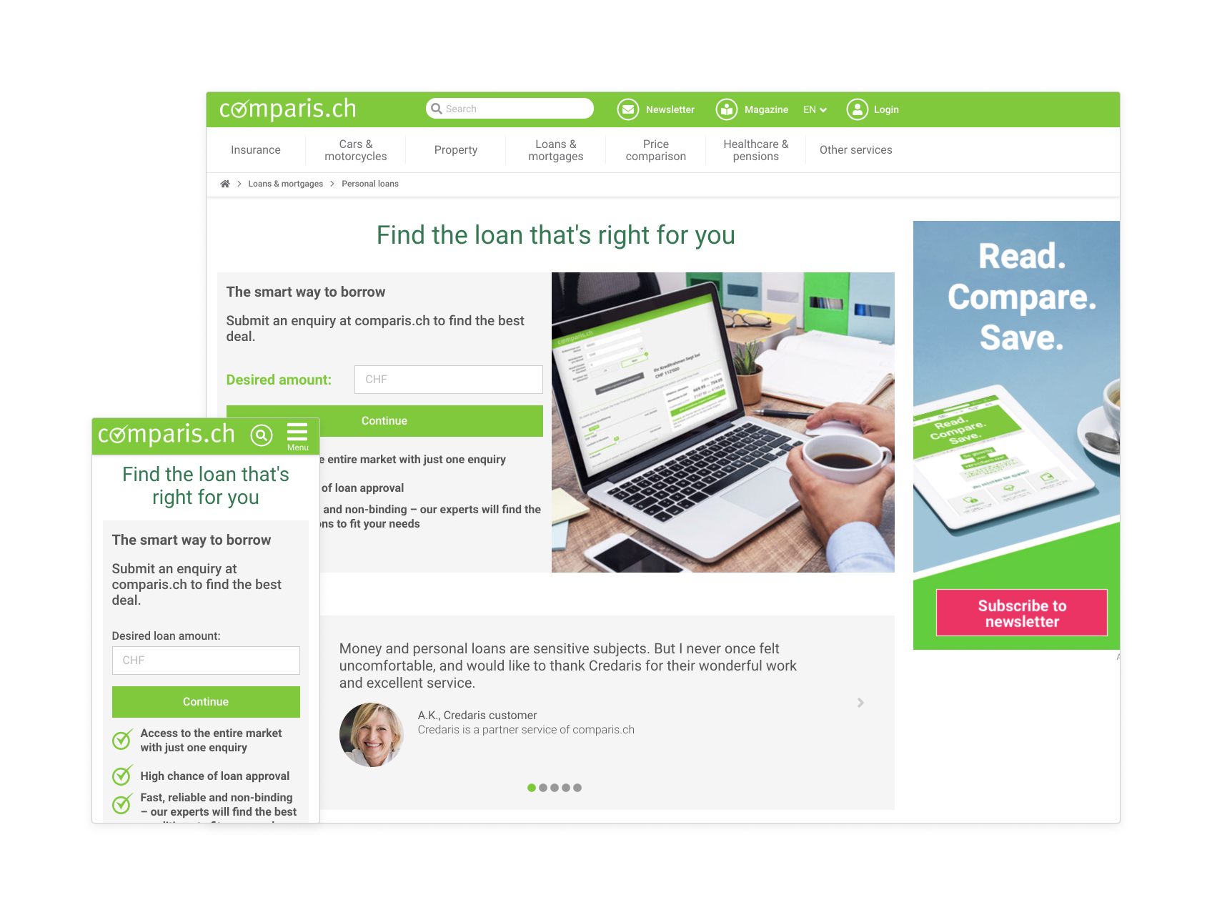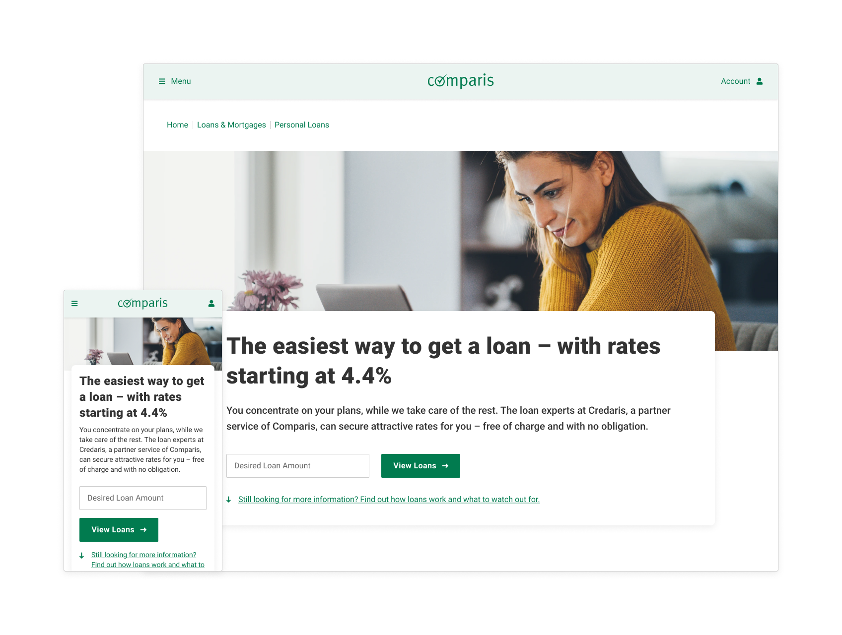 With a new centralised pattern library ↗ implemented and ready to use, I worked across multiple teams to redesign the full suite of Comparis products. We launched a number of pages on the site before I left in 2021, with further updates building upon those initial launches.